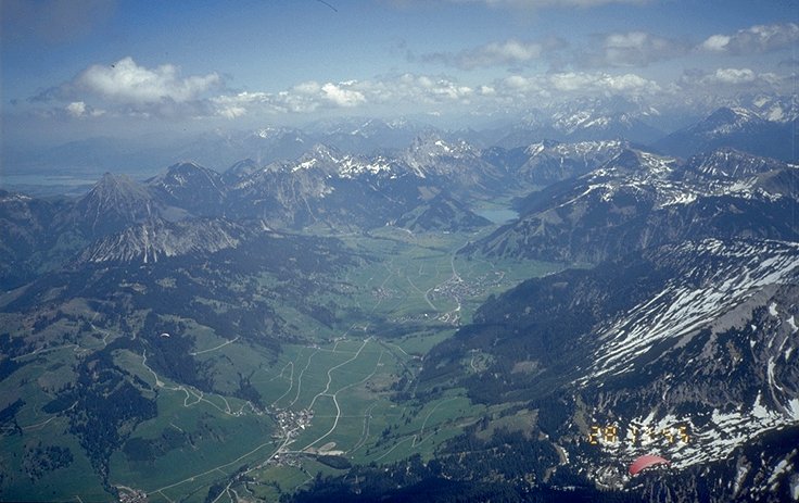 Thema dieses Kapitels ist es weniger, das Tannheimer Tal als Ausgangspunkt für die Streckenfliegerei zu schildern, vielmehr geht es um eine Beschreibung der Flugstrecke zwischen Iseler im Westen und der Gaichtspitze bzw. dem Hahnenkamm im Osten, wie man sie typischerweise vom Nebelhorn oder Hirschberg kommend abfliegen möchte. Natürlich ist diese Beschreibung auch für Piloten brauchbar, die am Neunerköpfel oder Hahnenkamm gestartet sind und sich das Tannheimer Tal entlang bewegen wollen.