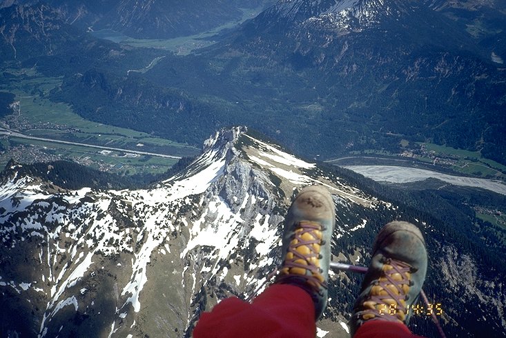 Beim Kurbeln über der Krinnenspitze hat man bereits einen weiten Blick in das Lechtal, in das man von hier aus Richtung Süden abzweigen kann. Sollte sich die Krinnenspitze als allzu spröde bei der Thermikausbeute zeigen, bitte nicht ins Lee der Südseite einfliegen. Der "Notbart" steht an der Nordwestecke des Gipfelbereiches, direkt an der dortigen Materialseilbahn. Diesen kann man auch nutzen, wenn man von der Gaichtspitze oder dem Hahnenkamm mit nur niedriger Höhe zurückkehrt.